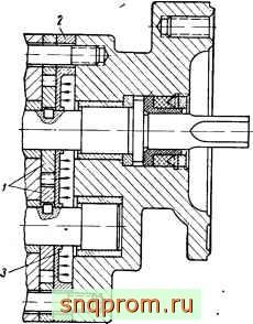 Одна из разновидностей конструкций насосов с прямым поджимом втулок показана на фиг. 68. Насос рассчитан на нагнетание небольших объемов жидкости при давлений до 70 кПсм. Уплотнение торцов роторов / осуществляется за счет прогиба бронзовой мембраны 2, на которую давит жидкость, подводимая в камеру 3 из зоны нагнетания. При этом способе уплотнения торцовые зазоры частично выбираются, но в результате неравномерного прогиба мембраны (в центральной части она прогибается больше) происходит неравномерный износ торцов роторов и мембраны.