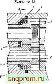 На фиг. 69 показана другая разновидность системы дифференциального поджима. Прижим плавающих втулок 1 к роторам 2 осуществляется давлением жидкости, подводимой по каналу 3 из камеры нагнетания. Площадь торцов втулок, на которую давит жидкость, изолирована уплотняющими кольцами 4 и 5. Дифферен-