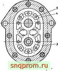 компенсация торцовых зазоров выполняется в этом насосе с помощью гибкой биметаллической (бронза-сталь) уплотняющей пластины 2, прижимаемой к торцам роторов давлением жидкости. Зазоры между пластиной 2 и крышкой уплотняются специальным армированным уплотнением 3, изготовленным из синтетической резины, которое одновременно предохраняет утечку жидкости по валам. Этим же уплотнением поверхность пластины 2, со стороны обратной к роторам, разбивается на ряд камер 4, числом равным числу междузубовых впадин. Каждая камера соединяется с междузубовой впадиной отверстием 5 малого диаметра, сделанным в пластине 2. Давление в каждой камере определяется положением отверстия 5 и является функцией градиента давления внутри междузубовых впадин. Размеры отверстий и их положение тщательно рассчитываются. Эта конструкция насоса более проста, чем конструкция со следящим (дифференциальным) прижимом поршнями (фиг. 88). Затруднение представляет лишь изготовление сравнительно сложного по конфигурации уплотнения.