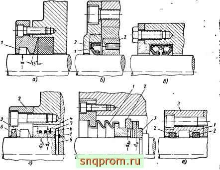 Одним из распространенных типов жестких (или так называемых механических) уплотнений вала в шестеренных насосах являются торцовые уплотнения, изображенные на фиг. 72, г.