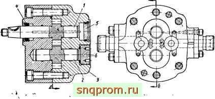 Гидравлическая компенсация торцовых зазоров осуществляется путем поджима уплотняющих втулок 2 давлением жидкости, подаваемой из камеры нагнетания в камеру б. Утечки по втулкам предотвращаются уплотнением 8.