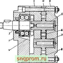 на которые давит жидкость, поступающая в камеры 9 из междузубового пространства по каналам 8. Приводной вал уплотнен манжетами 10.