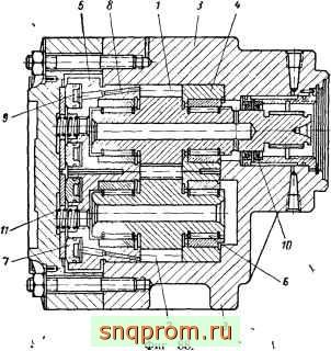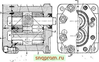 Насос состоит из стальных шестерен (роторов) 1 ц 2, выполненных за одно целое с валами, которые помещены в корпусе 3. Торцы роторов уплотняются бронзовыми втулками 4 и 5. Опорами валов служат игольчатые подшипники 6, расположенные во втулках. Подвижные втулки 5 поджимаются к торцам роторов поршнями 7,