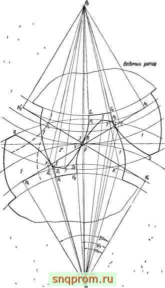 Это Соответствует симметричному расположению междузубовой впадины зубьев 7 и 2 ведущего ротора относительно линии центров или, что тоже, симметричному расположению точек контакта зубьев / и 2 ведущего ротора с зубом 2 ведомого ротора на линиях зацепления прямого {NN2) и обратного (jVi, N2) вращения (фиг. 14).