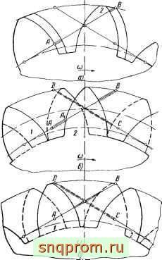 На фиг 15, а изображена ведущая шестерня насоса с углом наклона зубьев, обеспечивающим непрерывную изоляцию камер нагнетания и всасывания. В момент окончания контактирования зуба 2 с зубом ведомой шестерни в точке В линии зацепления на задней торцовой плоскости, в точке А передней торцовой плоскости вступает в контакт с зубом ведомой шестерни последняя точка зуба 1. Случай зацепления с боковым зазором, когда величина угла наклона больше значений, обусловленных неравенством (38), изображен на фиг. 15, б. Здесь видно, что изоляция рабочих камер насоса нарушается с момента поворота контактирующей пары зубьев