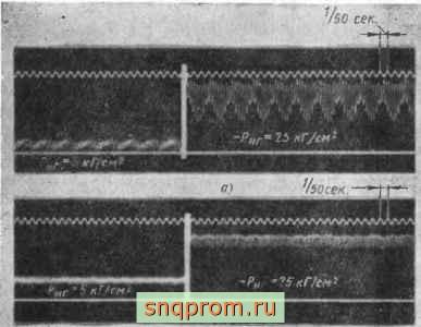 Идентичность этих величин свидетельствует о том, что использование роторов с винтовыми зубьями (при условии сохранения постоянной изоляции между камерами нагнетания и всасывания), не уменьшает величину пульсации подачи жидкости. Справедливость этого вывода подтверждается данными осциллографирова-ния (фиг. 16) пульсации давления в нагнетательном трубопроводе шестеренных насосов с винтовыми и прямыми зубьями.
