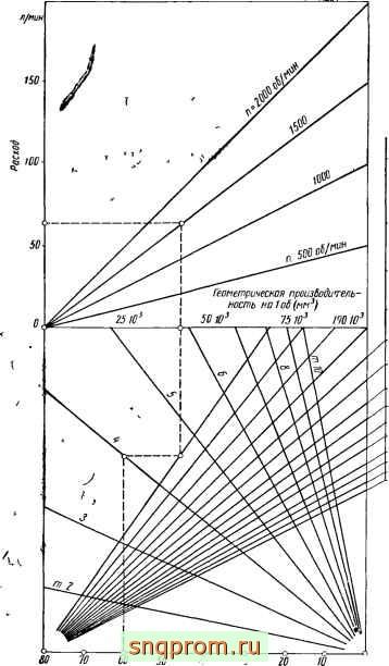 Для расчета параметров насоса можно также пользоваться номограммой, изображенной на фиг 36 Здесь производительность насоса должна браться с учетом объемного коэффициента полезного действия