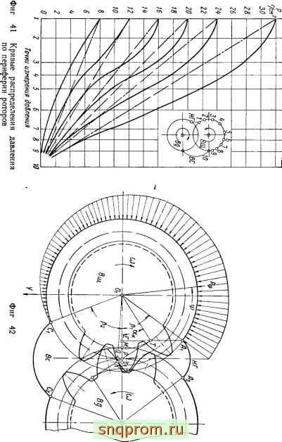 На фиг 41 изображены характерные кривые изменения давления в уплотняющей зоне шестеренного насоса от нуля до номинальной величины (40 кГ/см) Форма кривых меняется от выпуклых (при наибольших давлениях), до вогнутых (при наименьших давлениях) Переход от верхней кривой к нижней совершается постепенно Различие формы кривых определяется изменениями положения роторов в колодце корпуса, которые вызываются действием нагрузки Изменение величины рабочего давления влечет за собой изменение значения равнодействующей гидравлической нагрузки и направления ее действия При этом меняется положение экстремальных периферийных зазоров Все это отражается на форме кривой распределения давлений Обработка кривых распределения давления, соответствующих наибольшим значениям рабочего давления насоса показывает, что без большой погрешности и с запасом надежности закон изменения давления можно считать параболическим Излагаемый ниже расчет нагрузки на опоры роторов шестеренных насосов построен на этом предположении и основывается на наличии эффективной системы канализации жидкости, исключающей возможность возникновения дополнительных распорных нагрузок