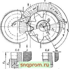 При выводе формул исходим из ряда допущений. В частности, считаем, что зона полного давления нагнетания р=Рнап1-Рве распространяется иа угол -ф, а переходная зона - на угол фо (см. фиг. 36). Эти давления передаются на части площадей секторов, ограниченные указанными углами и радиусами головок Re и впадин Ri. При этом в пределах угла ф передается полное давление р, а в пределах угла фо давление падает пропорционально величине угла от величины р до нуля. Такое допущение было принято и в предыдущей главе. Надо иметь в виду, что для рассматриваемого в настоящей главе случая торцового давления это допущение вносит меньшую неточность, чем для определения радиальных давле-