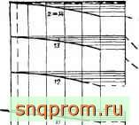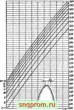 5. Номограмма VI (фиг. 60) дает возможность определять толщину зуба по окружности головок (заострение зуба). На номограмме вертикальные прямые соответствуют значениям а от 20 до 30°, а кривые - значениям z от 7 до 14. Горизопта^1ь, проведенная через точку их пересечения, определяет величину sjm- следовательно, для определения надо найденную величину помножить иа модуль т.