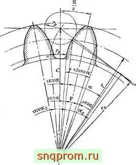 Как ранее было получено, угол профиля зуба в точке делитель ной окружности равен углу зацепления исходного контура (для стандартных колес ао=20), а угол между радиусом-вектором этой точки и радиусом начальной точки эвольвенты равен invoo.