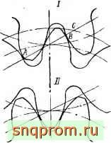 Фиг. 22. Начало зацепления (/) и положение минимального запертого объема ( ) при беззазорном зацеплении.