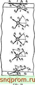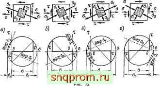 Графическое определение величии и направлений главных напряжений для четырех возможных вариантов напряженных состояний элементов, выделенных из балки, показано на рис 72