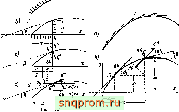 dM=dP/y - yi)=q(y - yt) sina ds. Элементарные усилия от силы dP в том же сечении (рис. 158, в): dN =dPy<m =q cosa sinp ds; dQ =~dPy cosp =~q cosa cosp ds; dM =dPy(x - x,)=q(x - Xi) cosa ds.