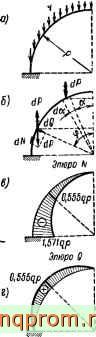 Решение. Усилия в поперечном сеченин под углом ф к вертикали от элементарной силы dP=qds=qpda. имеют значения (рис. 164, б).