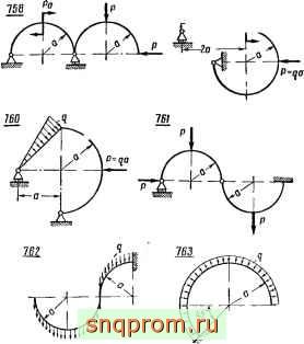 Эпюры N, Q к M показаны на рис 165, e, г, д. Задачи 756-765. Построить эпюры продольного усилия N, поперечной силы Q и изгибающего момента М.