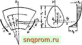 где 5 - статический момент площади F относительно нейтральной оси г, которая не проходит через центр тяжести сечения Ос; г - радиус кривизны нейтральной линии пп; у - координата рассматриваемой точки сечения от оси г (рис. 166).