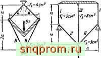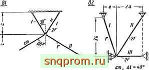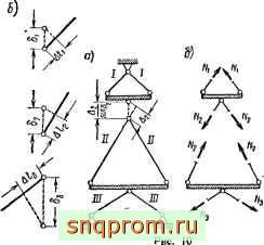 г) Определение монтажных напряжений (рис. 10, а). Из условий статики (рис. 10, б): 2Л', sinp, = 2iV2sinP2; 2jV2sinpj = 2A/.iSinPs. Из условия совместности перемещений'