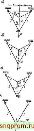 Решение. Так как элементы заданной системы имеют одинаковую жесткость сечения и испытывают только растяжение усилиями, постоянными по длнне, то для раскрытия статической неопределимости используем упрощенное уравнение (194).