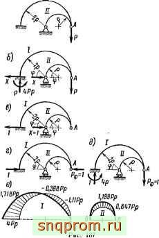 На рис. 181, в, г изображены эпюры М от Мф~1 и Pii,= l, приложенных в сечении А и направленных против часовой стрелки для Мф=1 и вертикально вниз для Рф=1.