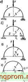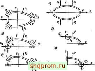 Если кольцо по геометрии и нагрузке симметрично относительно двух осей (рис 194, а), в сечениях, проходящих через оси симметрии, поперечные силы равны нулю, а продольные усилия можно определить из условия статики как Суммы проекций сил и усилий, приложенных к полукольцу, на соответствующую ось симметрии. В этом случае лишним неизвестным будет только изгибающий момент (Xj или Х/). Вместо всего кольца можно рассматривать одну его четверть, заключенную между осями симметрии (рис. 194, б или в)