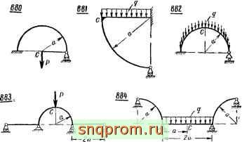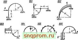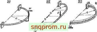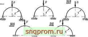 Задачи 907-910. Определить, ио сколько раз в указанных системах наибольший по абсолютному значению изгибающий момент и вертикальное перемещение среднего сечении меньше, чем в статически определимом кривом брусе (рис. задачи 907, а).
