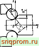 Пусть теперь угол г? перекоса, измеряемый в радианах, изменяется от - 2,2 Ю * до 2,2 10 *. На рис. 3.15 заштрихована область, внутрь которой не должен заходить круг контакта. Определив по формуле (3.105) при lA =150 мкм Д; = 14,6 мм, убеждаемся, что точка контакта выходит за пределы незаштрихованной области. Следовательно, значение/?о = 1,42 м слиипсом велико, так как приводит к краевому контакту. Используем метод последовательных приближений. Положимте = эфф/ = 4,05 мм, Ло = 400 мм. Тогда по формуле (3.102) Д^, =88 мкм, а по формуле (3.105) при 2Д2 = 150 мм Д^ = 7,75 мм. Построим (см. рис. 3.15) прямоугольник, ограниченный прямыми х = О, х = Д^, / = /о -\\\ =Уо + + \Ау\. Проведем две окружности одинакового максимально возможного радиуса с центрами в правых вершинах прямоугольника. Нижняя окружность радиуса Го = 1,7 мм касается нижней границь!, в то время как расстояние от верхней окружности до верхней границы достаточно велико. Поэтому целесообразно увеличить о и /?о, взяв, например, у о = 4,5, Ro = = 450 мм. Тогда Д^ = 0,1 мм, А^ = 8,2 мм. Построив соответствующий прямоугольник, видим, что Го = 1,8 мм. Из формулы (3.101) получаем