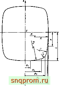 Рациональное профилирование ролика. Пусть эффективная длина дорожки (см. рис. 3.14, а) lg = 49 мм (длина ролика 52 мм, по 1,5 мм занимает каждая канавка для выхода шлифовального круга). Тогда методом, изложенным в подразд. 2.2, выберем оптимальные параметры двухрадиусного меридиана - большой радиус R, малый радиус г и координату а точки сопряжения дуг. При радиальной нагрузке на ролик f; = 15 кН и тг1 < 2,2 10 радиус /? = 60 м, г = 300 мм, д = = 21 мм. Используя параметры торца и меридиана, можно указать рациональную форму ролика (рис. 3.16) (разработка е.м. Филатовой), сечение которого плоскостью, проходящей через ось, представляет собой кривую, составленную из сопряженных дуг окружностей четырех различных радиусов R, г. Го, Ro и двух отрезков прямых. На торцах ролика имеются две плоские круговые области радиуса pi; фаска радиуса Го может быть технологической. Для изготовления ролика необходимо дать количественное описание поверхности. Введем функцию