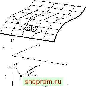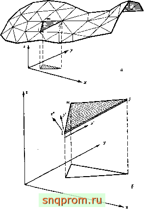 На фиг. 11.5,0 показана произвольная оболочка, разбитая на треугольные элементы. Все элементы ориентированы по отношению к координатным плоскостям совершенно произвольно. Определить локальные оси и их направляющие косинусы в этом случае значительно сложнее, чем в предыдущем более простом примере. Проще всего эта задача решается с использованием векторной алгебры; читателям, которые успели забыть ее основы, полезно обратиться к приложению 5.