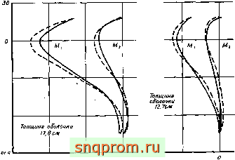 Когда нагрузка вызывает в основном мембранные напряжения, даже при достаточно мелком разбиении наблюдается некоторое расхождение в значениях изгибающих моментов. Однако с дальнейшим уменьшением размеров разбиения оно исчезает, особенно если при расчете значения моментов усредняются. Это необходимо делать для исключения влияния замены оболочки набором усеченных конусов. На фиг. 12.3 и 12.4 показано несколько типичных примеров, взятых из работы Графтоиа и Строума [1].