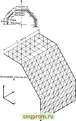 Фиг. 11.15. Складчатая конструкция из пластин [23]. Расчетная схема, нагружеиие и сетка элементов.