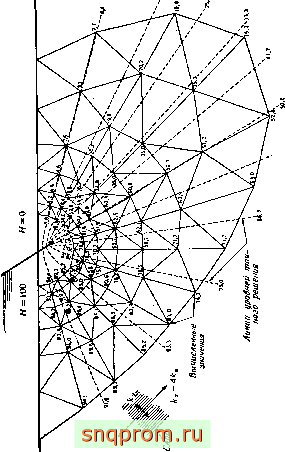Анизотропная фильтрация. Первая задача связана с исследованием течения жидкости через сильно неоднородные анизотропные искривленные слои грунта. Основное уравнение опять имеет вид (15.25). Однако программу следует модифицировать с тем, чтобы получить возможность изменять направление главных осей х' и у' при переходе от элемента к элементу. Никаких трудностей при решении не встречается. Расчетная схема и некоторые результаты приведены нафиг. 15.7.