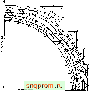 угольных элемента. Для того чтобы результаты можно было применить для любых ускорений, решены семь задач. В каждой из них на части границы, примыкающей к рассматриваемой точке, задано единичное ускорение, что дает в точках 1-7 нагрузки pV2b, pi, .. , р^-, р'/2/-. Давления в точках 1-56 при произвольном профиле ускорений можно представить в виде матрицы, зависящей от ускорений точек 1-7. Таким образом.