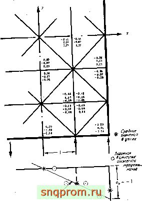 Можно убедиться, что если напряжения во внутренних узлах вычисляются как средние по примыкающим к ним элементам, то они очень мало отличаются от точных. Однако на внешних поверхностях усреднение дает несколько худшие результаты. Усреднение напряжений в узловых точках часто применяется для уточнения приближенного решения (фиг. 4.4).