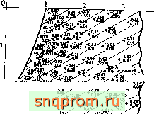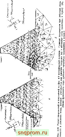 Гравитационные плотины. Расчет опорной плотины является характерным примером применения метода конечных элементов. Несложно рассмотреть и другой тип плотины - гравитационную плотину с быками или без них. На фиг. 4.13 приведены результаты расчета большой плотины с быками и подъемными затворами.