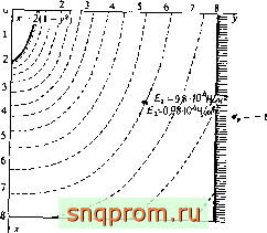 Подземная электростанция. Этот пример, иллюстрированный на фиг. 4.14 и 4.15, демонстрирует возможности метода. Главные напряжения вычерчиваются ЭВМ автоматически. Расчеты проводились при различных начальных напряжениях {оо), что связано с неточностью знаний геологических условий. Возможность быстрого решения задачи и представление результатов в виде графиков позволили оценить границы изменения напряжений и принять техническое решение.