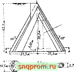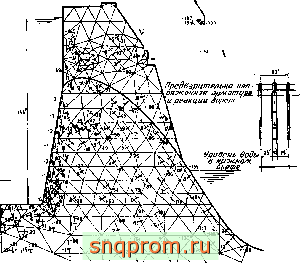 Здесь иажно отметить, что для одновременного изучения концентрации напряжений в местах крепления тросов и распределения напряжений в плотине и в основании используются элементы разных размеров. Линейные размеры элементов относятся как 30: 1 (самые большие элементы, использовавшиеся для исследования основания, на рисунке не показаны).