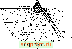 Плотина под действием внешнего и внутреннего давлений воды [8, 9] (фиг. 4.9). Исследуется опорная плотина на сложном скалистом основании. Неоднородное основание находится в условиях плоской деформации, а сама плотина рассматривается как пластина переменной толщины (плоское напряженное состояние).