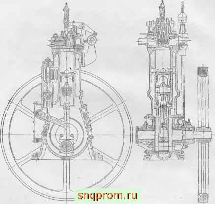 К постройке двухтактных двигателей и к опытным работам завод приступил в 1902-1903 гг. Была предложена конструкция двигателя с прямоточной клапанно-щелевой схемой продувки, с выпуском продуктов сгорания через клапаны Первый двигатель подобного типа был построен в 1906 г. на Нобелевском заводе (фиг. 5). Следует отметить положительные стороны этой конструкции, в которой при относительно хорошем качестве процессов газообмена поршень омывался холодным воздухом во время зарядки цилиндра.