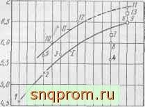 На фиг. 49 изображена зависимость допустимой степени сжатия от максимальных чисел оборотов, развиваемых коленчатым валом при полном открытии дроссельной заслонки, для автомобильных двигателей различных гипов.