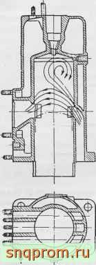 Фиг. 91. Цилиндр двухтактного двигателя с петлевой поперечной схемой продувки.