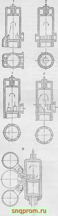 На схемах 4 и 5 приведены другие виды эксцентричного расположения окон: системы Шнюрле и Крупна, показавшие также хорошие результаты в отношении очистки и наполнения цилиндра. В случае схемы 4 потоки воздуха в цилиндре, встречаясь один с другим и со стенкой цилиндра, движутся вдоль стенки и далее описывают петлю, как в схеме 3.