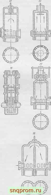 Клапанно-щелевая схема, в которой выпуск продуктов сгорания осуществляется через окна, а воздух или смесь подается через расположенные в крышке цилиндра клапаны, как уже отмечалось ранее, интереса не представляет вследствие крупных недостатков, присущих этой схеме. Из клапанно-щелевых схем единственной актуальной следует признать схему с выпуском продуктов сгорания через клапаны в крышке цилиндра и впуском воздуха через окна (фиг. 92, схемы 13 и 14).