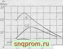 Из табл. 7 видно, что смеси с кислородом имеют значительно более высокие нормальные скорости распространения пламени, чем воздушные. Выше было отмечено, что скорости реакций зависят от концентрации реагентов, причем наличие в смеси компонентов, не участвующих в реакции, замедляет реакцию Этим объясняе1х:я зависимость скорости u ОТ концснтрации кислорода в окислителе и от состава