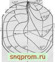 На фиг. 27 показаны последовательные положения при различных углах поворота кривошипа усредненного фронта пламени (турбулентные пульсации не показаны) в камере сгорания карбюраторного двигателя при малой скорости общего движения смеси в камере. Период задержки воспламенения в данном случае составляет около 5° угла поворота кривошипа, т. е. примерно 15% от полного периода распространения пламени, равного 35°. Образовавшийся фронт пламени движе1х:я почти равномерно; некоторое уменьшение скорости наблюдается около стенок в результате охлаждения. При наличии вращательного движения смеси в цилиндре форма фронта и скорость распространения пламени существенно изменяются (фиг. 28). Скорости распространения пламени в карбюраторных двигателях обычно составляют 15- 40 м/сек.