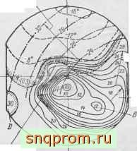 Схема распространения фронта пламени и воспламенения перед фронтом показана на фиг. 29. Положения фронта пламени при различных углах поворота кривошипа от момента зажигания (-20°) до момента появления очага воспламенения А перед фронтом (-4°) показаны штриховыми линиями. Мгновенные положения волны воспламенения, нанесенные сплошными линиями, помечены цифрами условной шкалы, одно деление которой соответствует 0,66-10 сек., так как весь процесс распространения воспламенения заканчивается в течение времени, соответствующего десятым долям градуса угла поворота кривошипа. Скорость распространения воспламенения от очага А и возникающего несколько позже очага В значительно больше скорости фронта пламени и в зоне С достигает 1200 м1сек. Положения возникшей ударной волны показаны штрих-пунктирными линиями. Скорость распространения этой волны составляет 1250 м/сек. При отражении ударной волны от стеики в зоне D возникает отраженная волна большей интенсивности, распространяющаяся в камере сгорания со скоростью 1300- 2300 м/сек (дальнейшие положения этой волны на схеме не показаны).