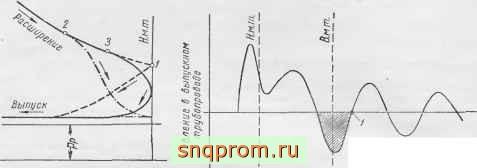 Предварение открытия выпускного клапана, т. е. открытие его до того момента, когда поршень дойдет до н. м. т., необходимо для того, чтобы создать условия для эффективной очистки цилиндра путем выпуска вследствие перепада давлений между цилиндром и выпускной системой. Для уменьшения динамической нагрузки клапанов требуется, чтобы в начальной период своего действия клапан относительно медленно открывал проходное сечение для газов. Поэтому предварение выпуска необходимо устанавливать таким, чтобы было обеспечено время-сечение, достаточное для понижения давления к моменту, когда поршень начинает свое обратное движение от н. м. т. Одновременно при правильном предварении выпуска уменьшается затрата энергии на выталкивание, что видно, например, из схематической диаграммы выпуска (фиг. 40, кривая от точки 3). Однако в случае чрезмерно большого предварения выпуска уменьшается полезная площадь индикаторной диаграммы и снижается мощность двигателя (кривая от точки 2 на фиг. 40).