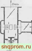 В смесителях для улучшения перемешивания газа и воздуха предусматривается, например, взаимное пересечение газовых и воздушных потоков, разделение потоков на отдельные струи и создание турбулентных потоков. Для предупреждения распространения взрывов по газопроводу смесители обычно снабжаются предохранительными клапанами. Схема такого смесителя с пересекающимися струями газа и воздуха показана на фиг. 183. Схема специального впускного клапана-смесителя изображена на фиг. 184.
