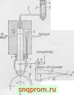 В показанном на схеме насосе соответствие дозы топлива нагрузке двигателя достигается изменением величины активного хода плунжера при сохранении полного его хода. Для этого насос имеет отсечной клапан 6 (или.