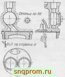 Для уменьшения потерь на перетекание газа из цилиндра в камеру во время хода сжатия можно увеличивать сечеиие соединительного канала, частично перекрывая его к концу хода сжатия поршнем. На фиг. 251 изображена такая камера шаровой формы, расположенная в блоке цилиндров. Соединительный канал прямоугольной формы частично перекрывается при